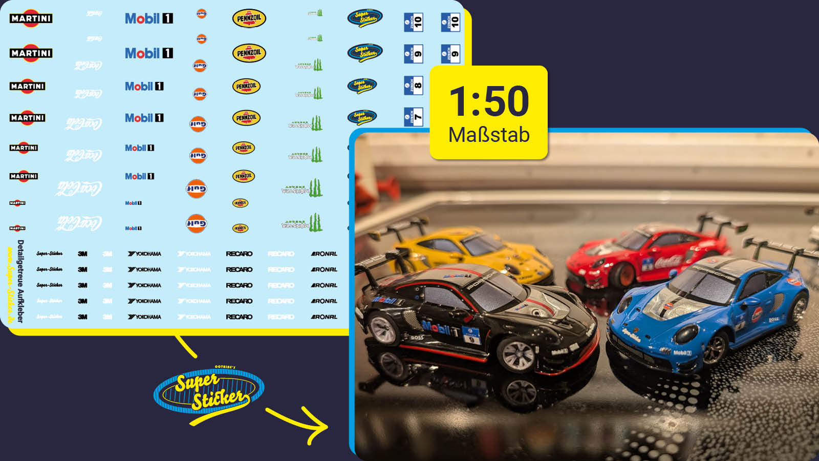 Der Wunsch war 6 Carrera Autos zu individualisieren. Jedes Auto sollte ein passendes Sponsoring und eine Startnummer erhalten. Eine Vorauswahl der Logos und ein Entwurf der Startnummernblocke waren die Basis.