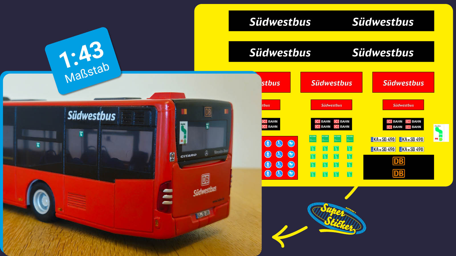 Im Maßstab 1:43 sollten diese Stadtbusse entstehen. Dafür gab es vom Kunden schon ein gute Vorlage und eine präzise Stückzahl der einzelnen Motive. Wir haben die Druckdatei angepasst und produziert. Das Ergebnis: Einfach toll anzusehende Modelle mit vielen kleinen Detailsstickern.