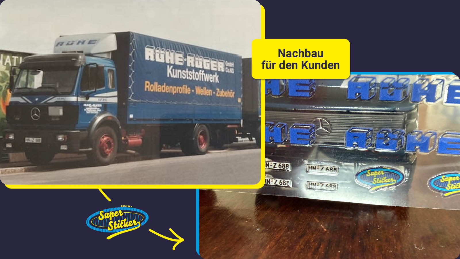 Stolze 1,8 Millionen Kilometer fuhr Alois mit diesem Mercedes LKW für die Firma Rühe-Rüger. Zu seinem 93. Geburtstag bekommt er von seinem Enkel diesen Nachbau seines einstigen „Firmenwagens“ zum Geburstag geschenkt. Eine echt tolle Idee, die wir gerne mit detailgetreuen Stickern unterstützt haben. Wir sagen Herzlichen Glückwunsch!!!